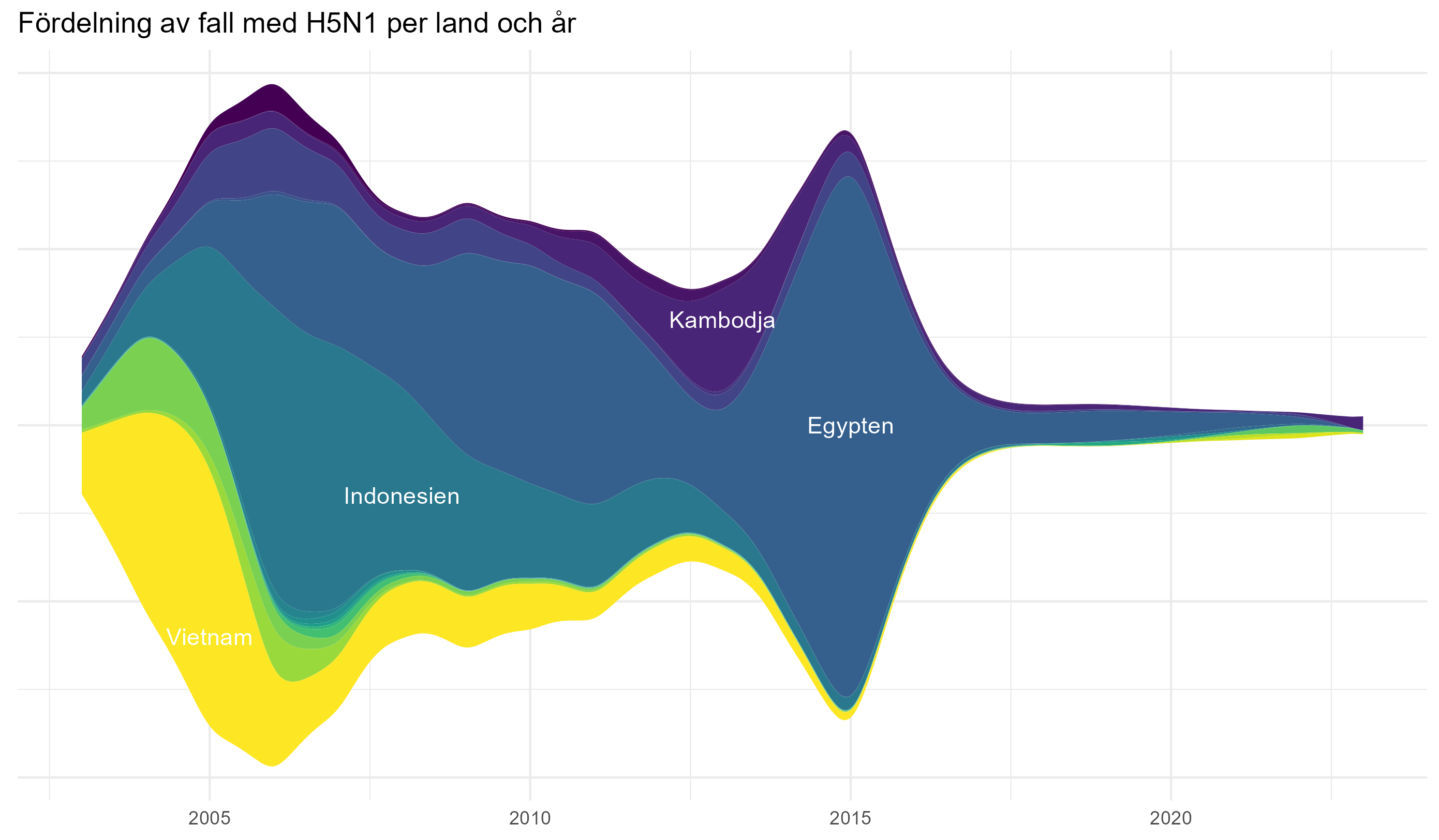 Figur 2. Fördelningen av H5N1 fall per land över tid, sedan 2003 till februari 2023.
