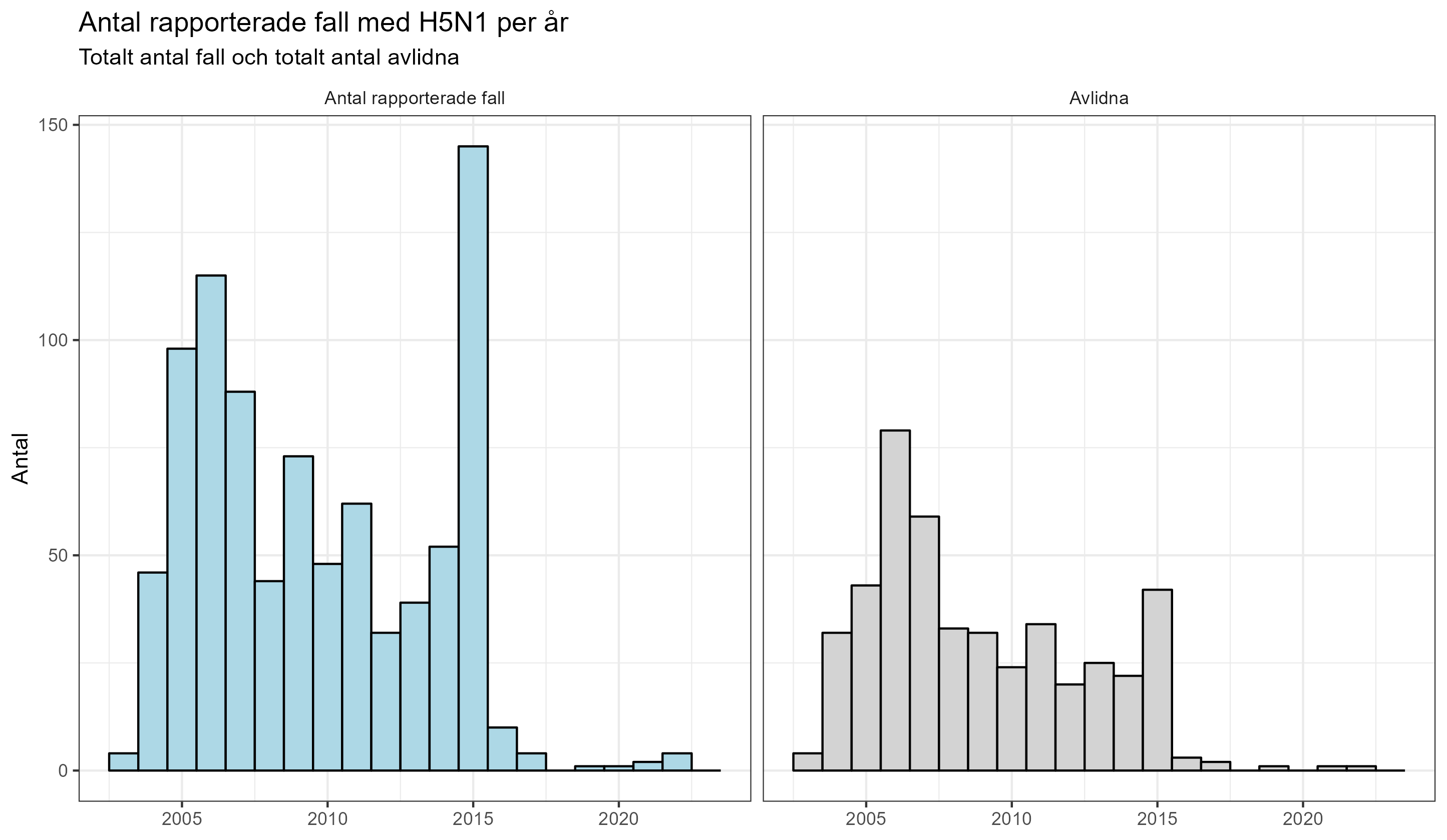 Figur 3. Antal rapporterade fall H5N1 per år, samt antal avlidna per år.